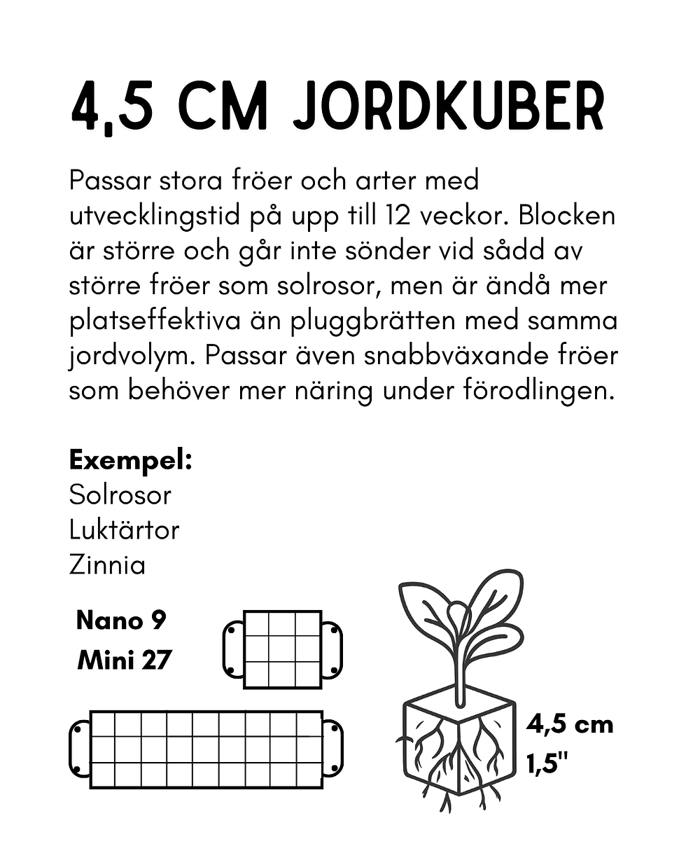 Soilblocksen ger otroligt fina rotsystem på plantorna, rötterna kan aldrig snurra sig i pluggarna eller krukorna, och du planterar ut de små kuberna med småplantorna direkt i jorden. Om du använder rätt kubstorlek behövs ingen omskolning!
